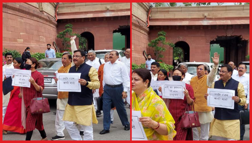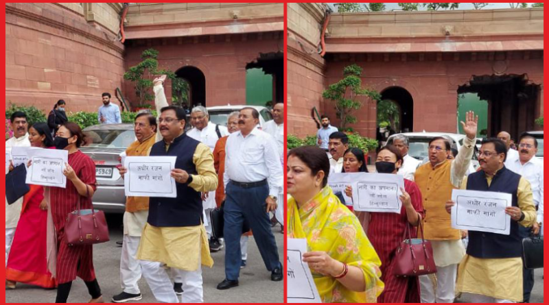 दिल्ली: कांग्रेस नेता अधीर रंजन चौधरी द्वारा देश की पहली महिला आदिवासी राष्ट्रपति महामहिम द्रौपदी मुर्मू पर की गई लिंग भेदी टिप्पणी पर राज्य सभा सांसद नरेश बंसल ने गहरी नाराजगी जताई है ।उन्होंने आज संसद भवन नई दिल्ली में साथी सांसदो संग देश की पहली महिला आदिवासी महामहिम राष्ट्रपति के अपमान के विरोध में प्रदर्शन किया । सासंद बंसल ने कहा कि राष्ट्रपति जी का अपमान ये देश नहीं सहेगा। यह जीभ फिसलना नही राष्ट्रपति का कांग्रेस नेता अधीरंजन चौधरी द्वारा जानबूझकर किया अपमान था । उन्होंने कहा कि कांग्रेस अध्यक्ष सोनिया गाँधी जी को आदिवासी समाज और महिलाओं के अपमान पर पूरे देश से माफ़ी मांगनी चाहिए। उन्होंने इसे कांग्रेस की तुच्छ मानसिकता का परिचय बताया । सासंद बंसल ने विपक्ष पर निशाना साधते हुए कहा कि विपक्षी दलों के सांसदो द्वारा संसद न चलने देने विपक्ष का चर्चा से भागना है ।उन्होंने इसे लोकतंत्र का हनन करार दिया ।