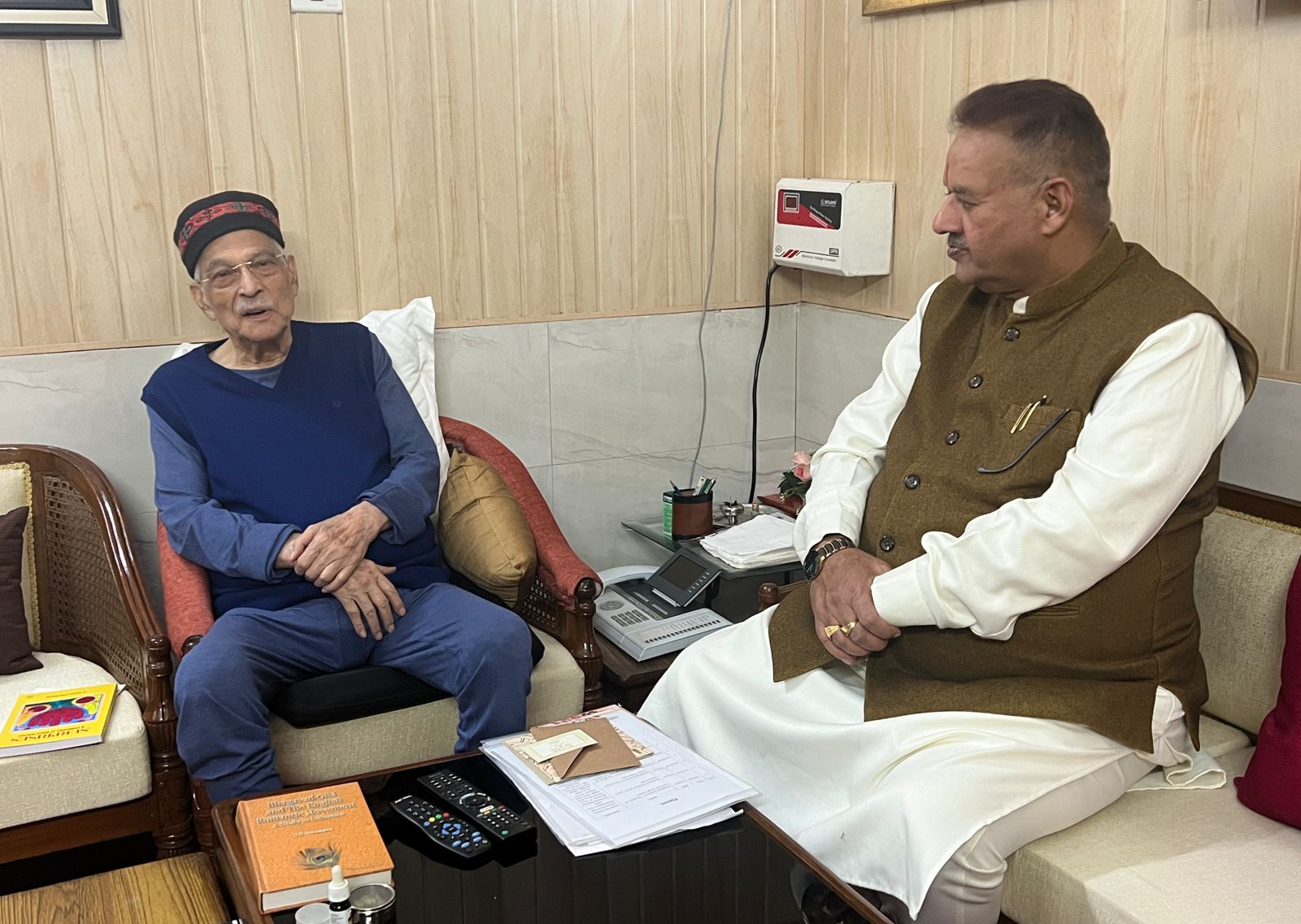 नई दिल्ली, 01 दिसंबर। प्रदेश के कृषि एवं कृषक कल्याण, सैनिक कल्याण एवं ग्राम्य विकास मंत्री गणेश जोशी ने नई दिल्ली में बीजेपी के वरिष्ठ नेता एवं पूर्व केंद्रीय मंत्री डॉ. मुरली मनोहर जोशी से उनके आवास पर शिष्टाचार भेंट कर उनका कुशलक्षेम जाना और उनका मार्गदर्शन प्राप्त किया। इस अवसर पूर्व केंद्रीय मंत्री डॉ. मुरली मनोहर जोशी ओर काबीना मंत्री गणेश जोशी के बीच कई समसामयिक विषयों पर चर्चा की गई। गौरतलब है कि मंत्री गणेश जोशी निगम चुनाव के चलते दिल्ली दौरे पर है और नई दिल्ली के कई वार्डो में भारतीय जनता पार्टी के प्रत्याशियों के पक्ष में मतदान की अपील करेंगे साथ ही कई जनसभाओं को भी सम्बोधित करेंगे।
