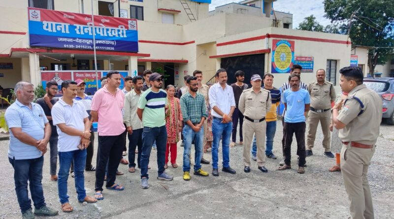 पुलिस महानिरीक्षक गढ़वाल परिक्षेत्र के आदेश पर तथा पुलिस उपमहानिरीक्षक/वरिष्ठ पुलिस अधीक्षक जनपद देहरादून के निर्देशन थानाध्यक्ष रानी पोखरी द्वारा पुलिस फोर्स के साथ आज थाना क्षेत्र निवासरत जन सामान्य को पुलिस द्वारा चलाए जा रहे हैं जन जागरूकता कार्यक्रम के अंतर्गत सड़क सुरक्षा के संबंध में जागरूक किया गया एवं सभी जन सामान्य को यातायात के नियमों का पालन करने दोपहिया वाहन पर हेलमेट के साथ सवारी करना दोनों सवारी द्वारा हेलमेट का प्रयोग करना, चौपहिया वाहनों में सीट बेल्ट का प्रयोग तथा काले शीशे का प्रयोग न करने, शराब पीकर वाहन न चलाना, वाहन चलाते समय वाहन संबंधी संपूर्ण दस्तावेज साथ रखना, यातायात के नियमों का पालन करने के लिये अवगत कराया गया। इस दौरान आवश्यक दिशा निर्देश भी दिए गए। जिसमें लगभग 60 से 70 लोगों को जागरूक किया गया।