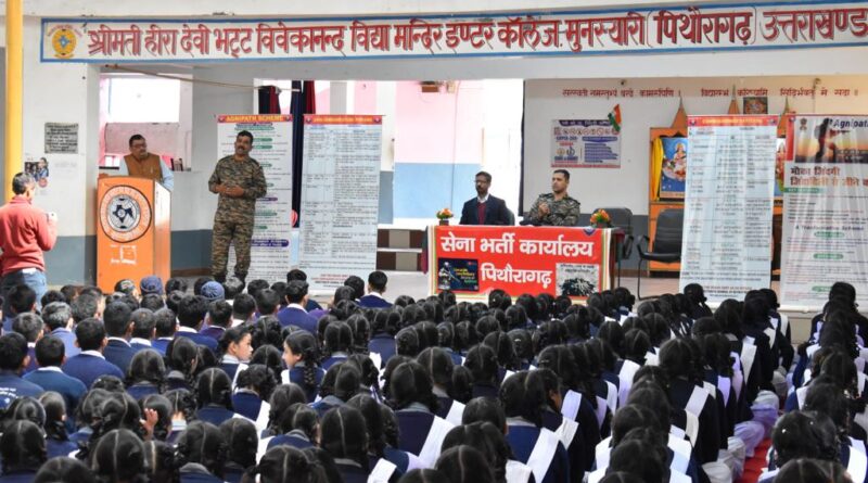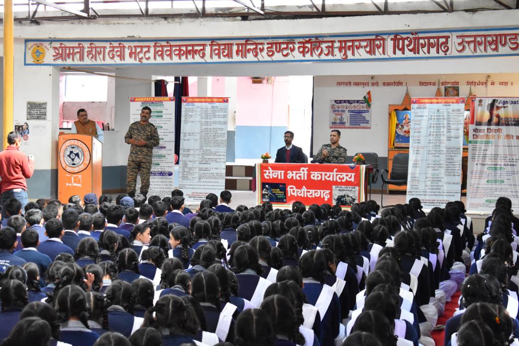 पिथौरागढ। अग्निपथ आउटरीच गतिविधिएआरओ पिथौरागढ द्वारा पिथौरागढ जिले के अंतर्गत मुनस्यारी तहसील के दूरस्थ क्षेत्र में कार्यक्रम स्थल सरकारी इंटर कॉलेज, मुनस्यारी और श्री हीरा देवी भट्ट, विवेकानंद विद्या मंदिर इंटर कॉलेज, मुनस्यारी में आयोजित की गई थी। स्कूली छात्रों को भारतीय सेना में अग्निपथ योजना के माध्यम से विभिन्न प्रवेश योजनाओं के बारे में जानकारी दी गई, साथ ही छात्रों को विभिन्न अधिकारी प्रवेश योजनाओं के बारे में भी जानकारी दी गई। छात्रों को सूचना पत्रक और ब्रोशर सौंपे गए। सद्भावना प्रचार के एक भाग के रूप में भारतीय सेना की लोगो डायरी स्कूल के शिक्षकों को वितरित की गई।