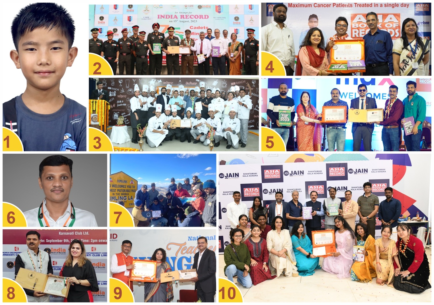 चूड़ाचांदपुर, मणिपुर की बेनहवी गंगटे (9) ने कीबोर्ड पर अधिकतम संख्या में गास्पेल (सुसमाचार) गीत बजाने और गाने का रिकॉर्ड बनाया। आजादी के 75 वर्ष पूरे होने के उपलक्ष्य में आयोजित साइकिल रैली में एनसीसी कैडेटों की सर्वाधिक संख्या में भाग लेने का रिकॉर्ड लक्ष्मीबाई राष्ट्रीय शारीरिक शिक्षा संस्थान, ग्वालियर द्वारा बनाया गया। इसी प्रकार, मडुआ आटा आधारित कुकीज़ की अधिकतम वैरायटी 60 मिनट में तैयार करने और प्रदर्शित करने का रिकॉर्ड इंस्टीट्यूट ऑफ होटल मैनेजमेंट एंड कैटरिंग टेक्नोलॉजी, रांची द्वारा स्थापित किया गया।