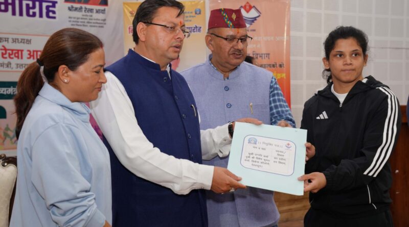देहरादून 11 मार्च। मुख्यमंत्री पुष्कर सिंह धामी ने सोमवार को मुख्य सेवक सदन में खेल नीति-2021 के अंतर्गत विभिन्न पदों पर चयनित राज्य के 31 विशिष्ट खिलाड़ियों को खेल विभाग, गृह विभाग, युवा कल्याण एवं वन विभाग में आउट ऑफ टर्न सेवायोजन, परिवहन विभाग में 25 कनिष्ठ सहायकों तथा उद्यान विभाग में 28 सहायक लेखाकारों को नियुक्ति पत्र प्रदान किये। इस प्रकार कुल 84 अभ्यर्थियों को मुख्यमंत्री ने नियुक्ति पत्र वितरित किये।