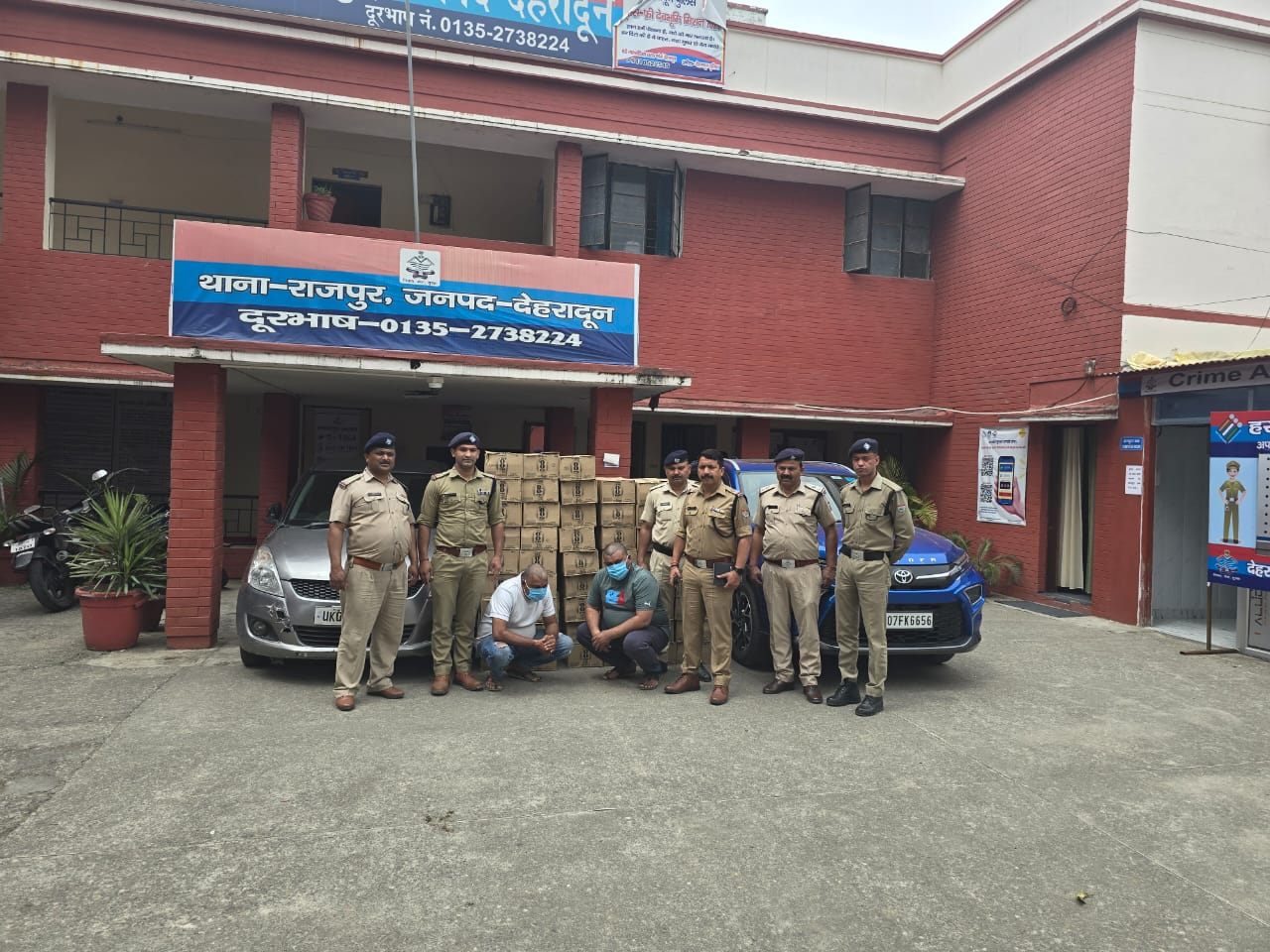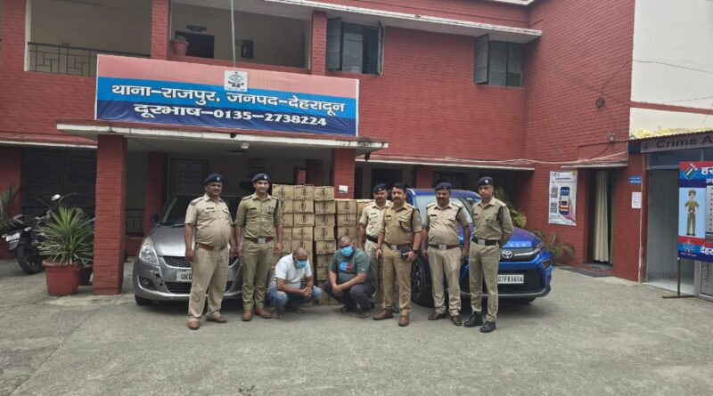 आगामी लोक सभा निर्वाचन 2024 के दृष्टिगत वरिष्ठ पुलिस अधीक्षक देहरादून अजय सिंह द्वारा सभी अधीनस्थों को अपने-अपने क्षेत्र में अवैध नशा, मादक पदार्थों की तस्करी तथा अवैध धन की रोकथाम हेतु प्रभावी कार्यवाही सुनिश्चित करने के निर्देश दियेे गये है। जिसके क्रम में जनपद के नगर तथा देहात क्षेत्रों में पुलिस द्वारा लगातार सघन चैकिंग अभियान चलाते हुए शराब, नशा तस्करों के विरूद्व प्रभावी कार्यवाही सुनिश्चित की जा रही है। इसी क्रम में आज थाना राजपुर पुलिस द्वारा थाना क्षेत्रान्तर्गत चलाये जा रहे सघन चैकिंग अभियान के दौरान अंशाल ग्रीन वैली में एक खाली प्लॉट के पास से 02 अभियुक्तो पवन राघव पुत्र स्वर्गीय नरेंद्र सिंह राघव निवासी बापू नगर विवेक विहार थाना राजपुर, उम्र 35 वर्ष को 37 पेटी अवैध अंग्रेजी शराब तथा दयानंद शर्मा पुत्र सियाराम शर्मा निवासी बापू नगर विवेक विहार थाना राजपुर देहरादून उम्र 33 वर्ष को 14 पेटी अवैध अंग्रेजी शराब, कुल 51 पेटी अवैध अंग्रेजी शराब के साथ गिरफ्तार किया गया तथा मौके से तस्करी में प्रयुक्त किये जा रहे 02 वाहनो को सीज किया गया। अभियुक्त के विरुद्ध थाना राजपुर पर मुकदमा अपराध संख्या 80/24 धारा 60/72 आबकारी अधिनियम के अंतर्गत अभियोग पंजीकृत किया गया।