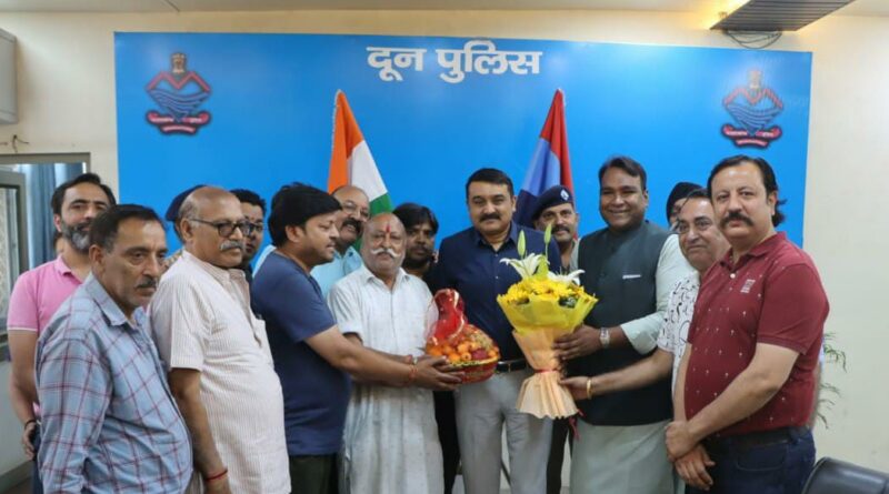 गौरतलब हैं की विगत 24/25 अप्रैल की रात्रि पल्टन बाजार में हुई आगजनी की घटना में दून पुलिस द्वारा त्वरित कार्यवाही करते हुए घटना में शामिल अभियुक्त अरूण कालरा को मुजफ्फरनगर से गिरफ्तार किया गया था। पुलिस द्वारा की गई त्वरित कार्यवाही की प्रशंसा करते हुए आज व्यापार मण्डल के पदाधिकारियों द्वारा पुलिस कार्यालय देहरादून में वरिष्ठ पुलिस अधीक्षक देहरादून अजय सिंह से शिष्टाचार भेंट की गई। भेंट के दौरान व्यापारी वर्ग द्वारा एसएसपी देहरादून के नेतृत्व में घटना के अनावरण हेतु दून पुलिस द्वारा की गयी त्वरित कार्यवाही की प्रशंसा करते हुए उन्हें पुष्प गुच्छ भेंट कर सम्मानित किया गया। शिष्टाचार भेंट के दौरान व्यापारी वर्ग से वार्ता के दौरान एसएसपी देहरादून द्वारा सम्पूर्ण बाजार क्षेत्र का सर्वे कर महत्वपूर्ण व संवेदनशील स्थानों पर सीसीटीवी कैमरे लगवाने व अन्य महत्वपूर्ण बिन्दुओं पर चर्चा की गयी, जिसमें व्यापारी वर्ग द्वारा अपना अपेक्षित सहयोग प्रदान करने का आश्वासन दिया गया। शिष्टाचार भेंट के दौरान सिद्धर्थ अग्रवाल कार्यकारी अध्यक्ष दून उद्योग व्यापार मण्डल, सन्तोख नागपाल अध्यक्ष पल्टन बाजार व्यापार मण्डल, सुनील मैसोन महासचिव दून उद्योग व्यापार मण्डल, कालू भगत, हरविन्दर सिंह, अभिषेक कक्कड व व्यापार मण्डल के अन्य सहयोगी, व्यापारी वर्ग उपस्थित रहे।