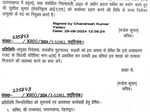 देहरादून। उत्तराखंड के रिटायर्ड आईएएस अफसर सुशील कुमार को राज्य निर्वाचन आयुक्त नियुक्त किया गया है। वह बीते साल गढ़वाल आयुक्त के पद से रिटायर हुए थे। राज्य निर्वाचन आयुक्त(पंचायतराज और स्थानीय निकाय) का पद बीते आठ माह से खाली था। वहीं, अब प्रदेश में पंचायत और निकाय चुनाव को देखते हुए शासन ने सुशील कुमार की नियुक्ति इस पद पर की है। आज गुरुवार को इसका आदेश जारी हो गया है।