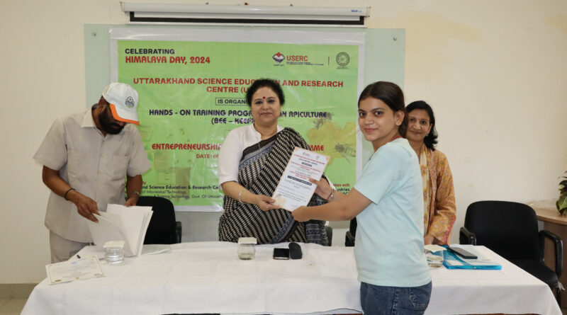 देहरादून। उत्तराखण्ड विज्ञान शिक्षा एवं अनुसंधान केन्द्र (यूसर्क) देहरादून द्वारा खादी ग्रामोद्योग विभाग देहरादून के संयुक्त तत्वाधान में आयोजित ’उद्यमिता विकास कार्यक्रम’ के अन्तर्गत मौन पालन (एपी कल्चर) विषय पर साप्ताहिक प्रशिक्षण कार्यक्रम के समापन अवसर पर यूसर्क की निदेशक प्रोफेसर (डॉ.) अनीता रावत द्वारा अपने सम्बोधन मे कहा कि दूरस्थ स्थान के महाविद्यालयों के छात्रों को उनके सर्वागीण विकास व प्रायोगिक ज्ञान को विकसित करने के उद्देश्य से यूसर्क द्वारा उद्यमिता विकास के लिये अनेकों प्रशिक्षणों का आयोजन किया जा रहा है।