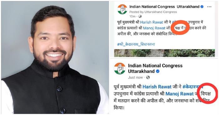 देहरादून। कांग्रेस सोशल मीडिया के अध्यक्ष विकास नेगी ने बीजेपी मीडिया सेल द्वारा पूर्व मुख्यमंत्री हरीश रावत की छवि और बयानों को तोड़-मरोड़कर प्रस्तुत किए जाने की कड़ी निंदा की है। उन्होंने कहा कि संलग्न स्क्रीनशॉट्स में पहला स्क्रीनशॉट उत्तराखंड कांग्रेस सोशल मीडिया सेल द्वारा जारी किया गया असली बयान है, जबकि दूसरा स्क्रीनशॉट बीजेपी मीडिया सेल द्वारा जानबूझकर बदला और विकृत किया गया है। श्री नेगी ने इस गंभीर मामले को जल्द ही चुनाव आयोग के संज्ञान में लाने की बात कही है, और कांग्रेस दोषियों के खिलाफ सख्त कार्रवाई की मांग करेगी।