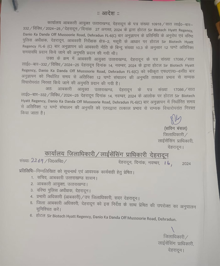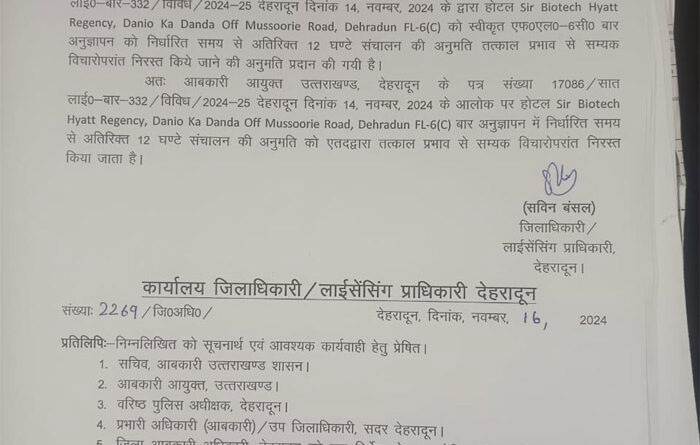 देहरादून,16 नवम्बर। जिलाधिकारी सविन बंसल ने जनपद अंतर्गत होटल हयात रेसीडेंसी को 24 घंटे बार संचालन की अनुमती को निरस्त करने की संस्तुति पर आबकारी आयुक्त ने उक्त अनुमति को निरस्त कर दिया है,जबकि वर्तमान डीएम के कार्यभार ग्रहण करने से पूर्व डीएम एवं आबाकारी आयुक्त द्वारा 27 अगस्त 2024 को हयात रेसीडेंसी को 24 घंटे बार संचालन की संस्तुति प्रदान की गई थी, जिसे वर्तमान डीएम की संस्तुति पर निरस्त कर दिया गया है, जो कि अब निर्धारित समयावधि रात्रि 11 बजे तक ही संचालित होगा।