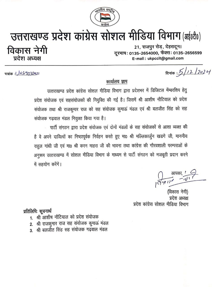 देहरादून। उत्तराखण्ड प्रदेश कांग्रेस सोशल मीडिया विभाग द्वारा प्रदेशभर में डिजिटल मेंम्बरशिप के लिये प्रदेश संयोजक एवं सहसंयोजकों की नियुक्ति की गई है। जिसमें आशीश नौटियाल को प्रदेश संयोजक तथा राजकुमार राज को सह संयोजक कुमाऊं मंडल एवं बलजीत सिंह को सह संयोजक गढ़वाल मंडल नियुक्त किया गया है। उक्त जानकारी देते हुए प्रदेश कांग्रेस सोशल मीडिया विभाग के प्रदेश अध्यक्ष विकास नेगी ने बताया कि प्रदेशभर में पार्टी का डिजिटल मेंम्बरशिप कार्यक्रम चलाया जा रहा है जिसके तहत प्रदेश संयोजक एवं मंडलवार सहसंयोजकों की नियुक्ति की गई है। पार्टी संगठन द्वारा प्रदेश संयोजक एवं दोनों मंडलों के सह संयोजकों से आशा व्यक्त की है वे अपने दायित्वों का निश्ठापूर्वक निर्वहन करते हुए मल्लिकार्जुन खडगे, राहुल गांधी एवं करन माहरा की भावना तथा कांग्रेस की गौरवशाली परम्पराओं के अनुरूप उत्तराखण्ड में सोशल मीडिया विभाग के माध्यम से पार्टी संगठन को मजबूती प्रदान करने में सहयोग करेंगे।