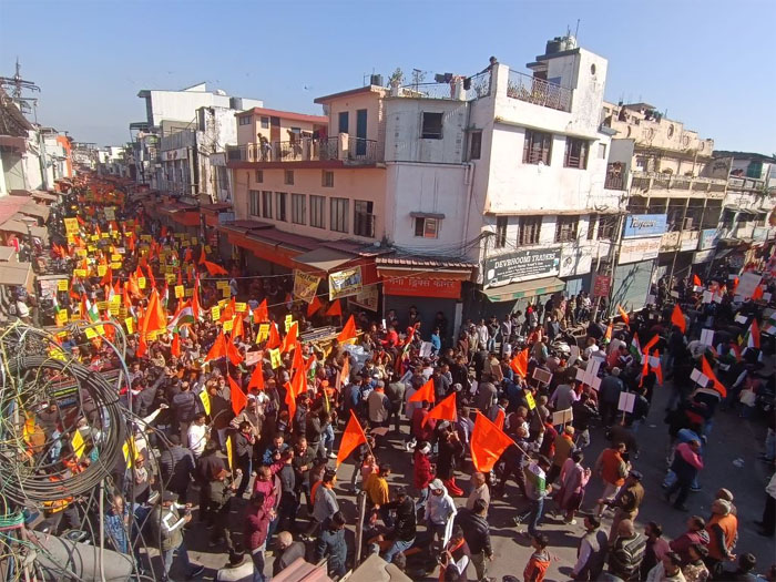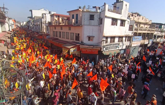 आज यहां हिन्दूवादी संगठनों के साथ ही विभिन्न संगठनों ने बांग्लादेश में हिन्दुओं पर हो रहे हमलों के विरोध में आक्रोश रैली का आयोजन किया गया। सुबह से ही विभिन्न सामाजिक, धार्मिक, समस्त मठ—मंदिरों, ब्राहमण समाज, व्यापार मंण्डल, सफाई कर्मचारी संगठन, केमिस्ट एसोसिएशन, पलटन बाजार व अन्य दुकानदार समितियोंं के कार्यकर्ता रेंजर्स ग्राउंड में एकत्रित होने शुरू हो गये। इसके साथ ही अधिवक्ता भी अपने कार्य से विरत रहे और आक्रोश रैली को अपना पूर्ण समर्थन दिया। इस दौरान कचहरी में स्टांप वेंडर, टाइपिग आदि गतिविधियां भी पूरी तरह से बंद रही। इसके साथ ही व्यापार मंडल ने भी दो घंटे बाजार बंद रखा। उनका कहना था कि बांग्लादेश में जातीय आधार पर अल्पसंख्यकों का उत्पीडन और यातनाएं दी जा रही हैं। कटटरपंथियों की ओर से मानवाधिकारों को तिलांजलि दी जा रही है। खुलेआम मानवाधिकारों का हनन किया जा रहा है। वहां की सरकार मूक दर्शक बनी हुई है। रैली रेंजर्स ग्राउंड से दर्शनलाल चौक, घंटाघर चौक, पलटन बाजार, धामावाला, राजारोड चौक, लक्खीबाग चौक से होते हुए प्रिंस चौक से कचहरी स्थित जिलाधिकारी कार्यालय पहुंची। जहां पर उन्होंने जिलाधिकारी के माध्यम से राष्ट्रपति व प्रधानमंत्री को ज्ञापन प्रेषित किया। इस दौरान पुलिस प्रशासन ने भी सुरक्षा के कडे इंतेजाम किये हुए थे।