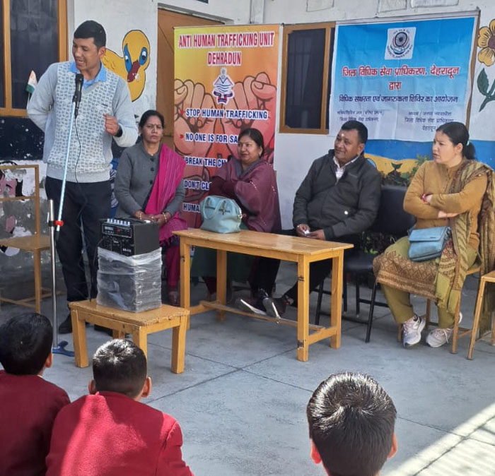 देहरादून। उत्तराखंड राज्य विधिक सेवा प्राधिकरण नैनीताल के आदेश पर एवं सचिव जिला विधिक सेवा प्राधिकरण देहरादून के निर्देशन में प्राविधिक कार्यकर्ता उमेश्वर सिंह रावत द्वारा आज स्थानीय एवंनेजर जूनियर हाई स्कूल नेशविला रोड देहरादून में मानव तस्करी एवं बाल श्रम विषय पर एक जागरूकता शिविर का आयोजन किया गया। जागरूकता शिविर में एंटी ह्यूमन ट्रैफिकिंग यूनिट देहरादून की टीम के सदस्य नरेंद्र सिंह बिष्ट द्वारा छात्र-छात्राओं को मानव तस्करी पर जागरूक किया गया। श्री बिष्ट ने छात्र-छात्राओं को बताया कि किसी भी व्यक्ति की खरीद फरोख्त करना, विवाह के नाम पर बालिकाओं, महिलाओं की खरीद फरोख्त करना, भीख मंगवाना जबरन घरेलू काम करवाना, अबैध तरीके से बच्चे को गोद लेना, जबरन ड्रग्स तस्करी करवाना अश्लील सामग्री तैयार करवाना, नौकरी अथवा किसी अन्य प्रकार का लालच देकर शोषण करना उपरोक्त सभी कार्य ह्यूमन ट्रैफिकिंग के अंतर्गत आते हैं। प्राविधिक कार्यकर्ता उमेश्वर सिंह रावत द्वारा छात्र-छात्राओं को गुड टच बेड टच, बाल श्रम, तथा 6 वर्ष से 14 साल तक के बच्चों को आरटीआई के तहत निशुल्क शिक्षा का अधिकार प्राप्त है आदि के विषय पर विस्तृत जानकारी दी। इसके साथ ही जिला विधिक सेवा प्राधिकरण से मिलने वाली निशुल्क सेवाओं के बारे में, नालसा टोल फ्री नंबर 15100 तथा राष्ट्रीय लोक अदालत जो की 8 मार्च को होने जा रही है के बारे में भी जानकारी दी। इस अवसर पर एंटी ट्रैफिकिंग यूनिट की श्रीमती अनीता कंडारी,श्रीमती प्रेमा बिषट, विद्यालय की प्रधानाध्यापिका श्रीमती शेफालीका सिंघल, विभु सिंघल, श्रीमती संगीता भंडारी एवं 80 छात्र-छात्राओं ने प्रतिभाग किया।
