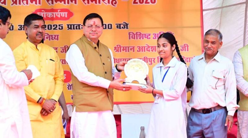 देहरादून। उत्तराखंड राज्य के मुख्यमंत्री पुष्कर सिंह धामी ने आज विद्या मंदिर इंटर कॉलेज रानीपुर, हरिद्वार में आयोजित ‘प्रतिभा सम्मान समारोह’ में सम्मिलित होकर मेधावियों को सम्मानित करने के साथ ही स्कूल में स्मार्ट क्लास से सुसज्जित नवनिर्मित भवन का लोकार्पण किया। इस अवसर पर मुख्यमंत्री पुष्कर सिंह धामी ने छात्रों द्वारा लगाई गई विज्ञान प्रदर्शनी का अवलोकन कर उन्हें विज्ञान और नवाचार के क्षेत्र में आगे बढ़ने हेतु प्रोत्साहित किया। उन्होंने कहा की हमारी सरकार प्रदेश में गुणवत्तापूर्ण शिक्षा के प्रसार हेतु निरंतर प्रयासरत है। मेधावी छात्रों को छात्रवृत्ति प्रदान करने के साथ-साथ भारत भ्रमण योजना की शुरुआत इसी दिशा में एक ठोस कदम है। हमारा उद्देश्य छात्रों को प्रतिभावान, संस्कारवान बनाने के साथ ही नवीनतम तकनीक से भी जोड़ना है, ताकि वे देश और दुनिया में प्रदेश का नाम रोशन कर सकें। छात्रों से आग्रह है कि वे खेल को केवल मनोरंजन नहीं, बल्कि एक उज्ज्वल करियर विकल्प के रूप में भी देखें।