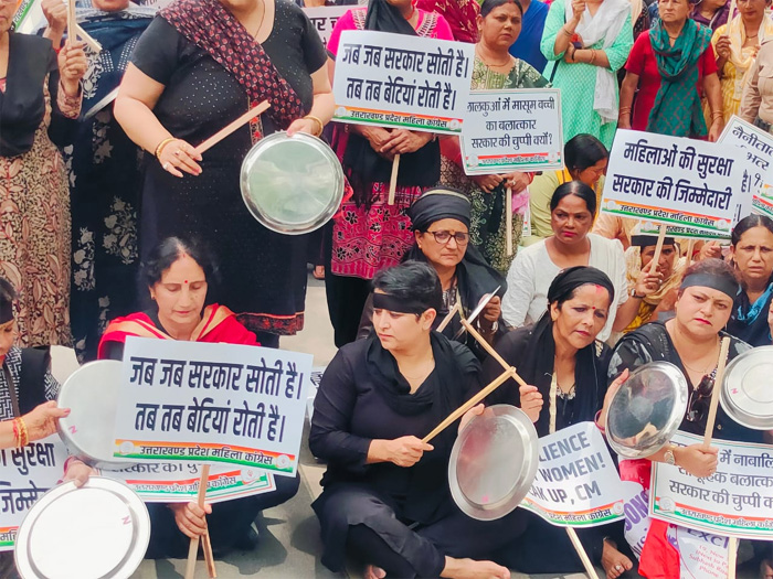 देहरादून। प्रदेश महिला कांग्रेस की अध्यक्ष ज्योति रौतेला के नेतृत्व में सैंकडों महिलाओं ने राज्यभर में आये दिन हो रहे महिलाओं के साथ बलात्कार, उत्पीड़न एवं अत्याचार के खिलाफ सेंट्रियो मॉल से नगे पांव कूच कर थालियां बजाकर मुख्यमंत्री आवास के बाहर सरकार का पुतला दहन किया। इस अवसर पर ज्योति रौतेला ने कहा कि महिलायें इस तरह की यातनाओं को कब तक सहन करेगी। उन्होंने कहा बलात्कारी किसी भी जाति धर्म को हो उसे कड़ी सजा मिलनी चाहिए। लेकिन जिस तरह का शर्मनाक अपराधिक कुछ शरारती तत्वों द्वारा किया जा रहा है वह बेहद शर्मनाक है। जिसे हमारा संविधान इजाजत नही देता है। उन्होने कहा कुछ लोग सरकार का फायदा उठाकर देवभूमि को कलंकित करने का काम कर रहे हैं, सरकार को उन अराजक तत्वों को चिन्हित कर दण्ड देना चाहिए। जो अपराधी है उसे किसी भी हालत में छोड़ा नही जाना चाहिए। उन्होंने कहा भाजपा के नेता महिलाओं के लिए लगातार आपमानजनक टिप्पणी कर रहे हैं, उन पर भी सख्त कार्यवाही होनी चाहिए। उन्होंने कहा एक तरफ भाजपा ’’बेटी बचाओ बेटी पढाओ का नारा दे रही है दूसरी तरफ उनका संरक्षण करने में पूरी तरह असफल हुई है। इस अवसर पर ज्योति रौतेला ने कहा कि जिस राज्य का निर्माण ही महिलाओं के बलिदान और संघर्ष से हुआ आज उसी देवभूमि में महिलाओं को अपनी अस्मत बचाने के लिए सड़कों पर उतरकर सरकार को जगाना पड़ रहा है, तो इससे शर्मनाक हकिकत और क्या होगी। एक तरफ धामी सरकार सर्वोत्तम राज्यों में अव्वल आने का ढिढोरा पीट रही है तो वहीं प्रदेश महिला अपराधों के आंकडों में देशभर में तेजी से आगे बढ़ रहा है। ज्योति रौतेला ने महिलाओं से अपील करते हुए कहा कि आप कब तक वहसी लोगांे का शिकार होते रहंेगी। कब तक अपमान, धमकियां, यौन शोषण, हिंसात्मक धटनाओं का शिकार होते रहेंगी। उन्होंने कहा कि घरेलू महिलाओं के अलावा सरकार दफ्तरों में काम कर रही महिलायें भी अपने आप को सुरक्षित महसूस नही कर रही हैं। उन्होंने कहा कि महिलाओं को आत्मनिर्भर होने के साथ-साथ सख्त और कठोर होने की जरूरत है। ऐसे लोगों का डठकर मुकाबला करने की आवश्यकता है। ज्योति रौतेला ने कहा कि उत्तराखण्ड राज्य में कानून व्यवस्था पूरी तरह से ध्वस्त हो चुकी है और बेटी बचाओ-बेटी पढ़ाओ का नारा देने वाली भाजपा सरकार में महिलाओं पर अत्याचार की घटनायें लगातार बढती जा रही हैं। उन्होंने कहा बेटियों की हत्या की जा रही है और सरकार के कानों पर जूॅ तक नही रैंग रही है। उन्होंने कहा भाजपा सरकार अपराधियों को खुला संरक्षण देेने का काम कर रही है। जिसे कांग्रेस बर्दाश्त नही करेगी और जन सरोकारों के लिए लड़ती रहेगी। विरोध प्रदर्शन मंे महानगर कांग्रेस कमेटी के अध्यक्ष उर्मिला ढौडियाल थापा, महामंत्री चन्द्र