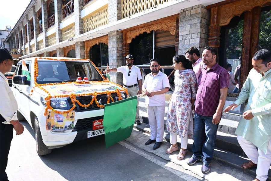 उत्तरकाशी। उत्तरकाशी में गंगोत्री विधायक सुरेश चौहान एवं अपर जिलाधिकारी श्रीमती मुक्ता मिश्र ने कलेक्ट्रेट परिसर से शहीद सम्मान यात्रा को हरी झंडी दिखाकर रवाना किया। यह यात्रा आज टिहरी व कल लैंसडाउन पहुंचेगी। इससे पूर्व वीर सपूत रायचन्द असवाल ग्राम बगासू एवं राइफलमैन शहीद शैलेन्द्र सिंह कठैत ग्राम कुमराड़ा के आंगन से मिट्टी कलश में भरकर सम्मानपूर्वक जिला मुख्यालय लाया गया था। आज उसे पूर्ण विधि विधान से लैंसडाउन भेजा गया। विधायक एवं अपर जिलाधिकारी ने वीर शहीदों के अमर बलिदान को नमन करते हुए श्रद्धांजलि अर्पित की और उनके परिवारों के साहस को सलाम किया।
