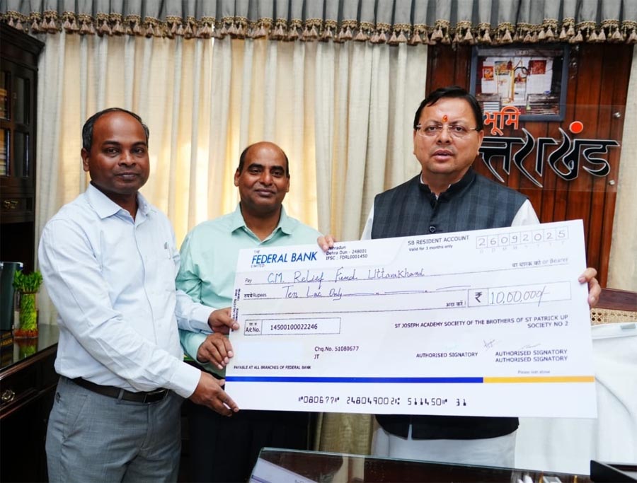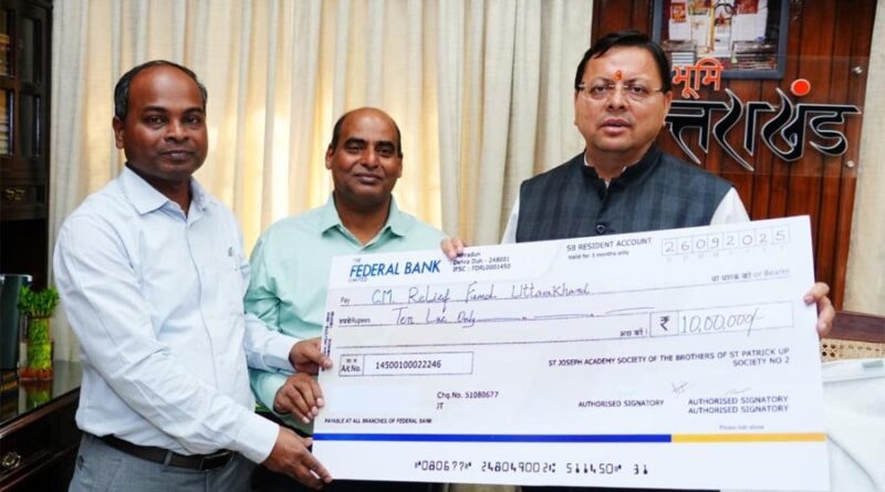 देहरादून। मुख्यमंत्री पुष्कर सिंह धामी से आज मुख्यमंत्री कैंप कार्यालय में सेंट जोसेफ अकादमी, देहरादून के स्कूल प्रबंधन ने मुलाकात कर आपदा पुनर्निर्माण कार्यों हेतु मुख्यमंत्री राहत कोष में ₹10 लाख की धनराशि प्रदान की। मुख्यमंत्री ने सेंट जोसेफ अकादमी का आभार व्यक्त करते हुए कहा कि यह योगदान आपदा प्रभावितों की सहायता एवं पुनर्निर्माण कार्यों के लिए उपयोगी सिद्ध होगा। उन्होंने कहा कि राज्य सरकार प्रत्येक आपदा प्रभावित व्यक्ति के साथ खड़ी है। इस अवसर पर ब्रदर जोसेफ एम. जोसेफ, ब्रदर एस्टिनस कुजूर, एसके.नैथानी, सचिन अग्रवाल, भवनेश नेगी मौजूद रहे।