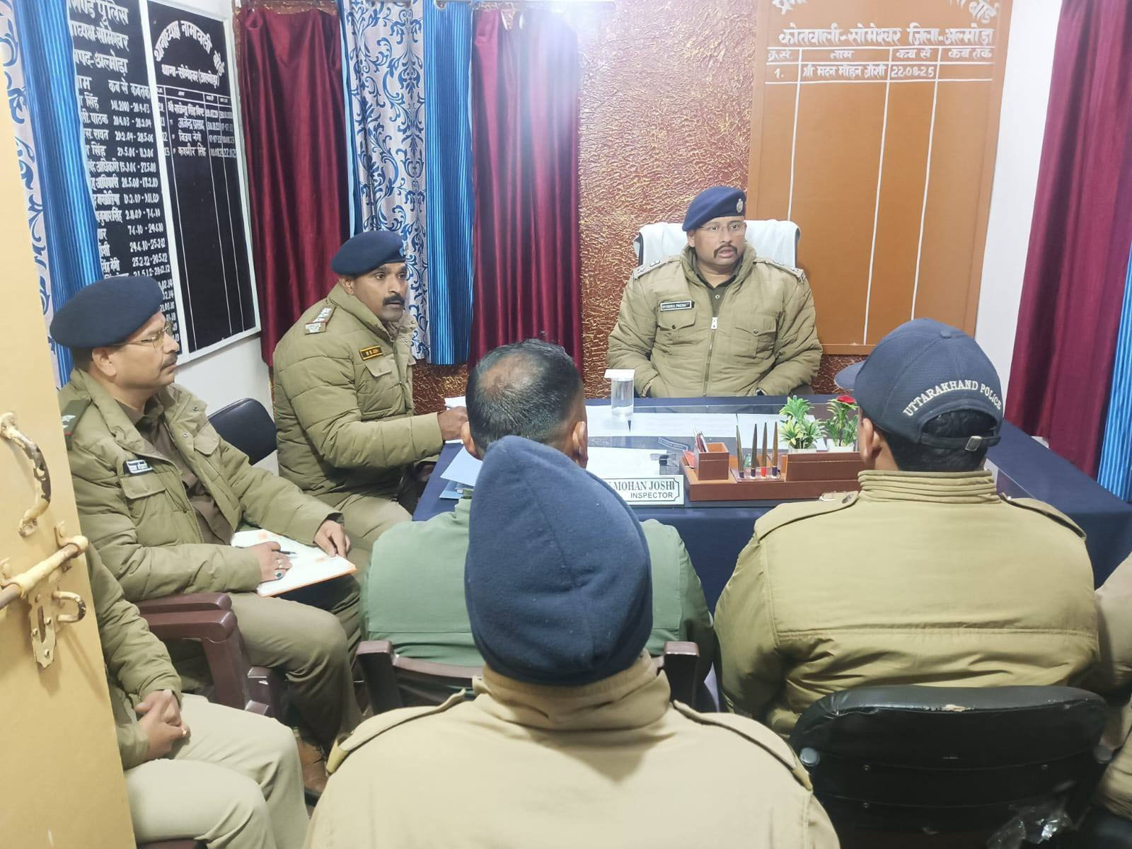 अल्मोड़ा। देवेन्द्र पींचा, वरिष्ठ पुलिस अधीक्षक अल्मोड़ा द्वारा कोतवाली सोमेश्वर पहुंचकर पुलिस अधिकारी, कर्मचारियों का सम्मेलन लिया गया। इस दौरान विभिन्न विषयों पर चर्चा कर आवश्यक दिशा निर्देश दिये गये। सर्वप्रथम थाना हाजा में नियुक्त अधिकारी/कर्मचारीगणों का सम्मेलन लेकर समस्यायें सुनी और निराकरण का आश्वासन दिया। जवानों को नशे के विरुद्ध टीम वर्क के साथ कार्यवाही करने के लिये प्रोत्साहित किया। कोतवाली क्षेत्रान्तर्गत शांति एवं कानून व्यवस्था को अक्षुण्य बनाये रखने हेतु गश्त, पिकेट, चीता, पेट्रोलिंग आदि ड्यूटियां लगाने हेतु आवश्यक निर्देश दिये गये। वर्तमान परिदृश्य के देखते हुए संदिग्धों की तलाश हेतु सघन सत्यापन अभियान चलाने के निर्देश दिये गये। जवानों को अपने-अपने बीट क्षेत्र में लगातार भ्रमणशील रहकर स्मार्ट एवं इफैक्टिव पुलिसिंग के लिये प्रोत्साहित किया। साथ ही एसएसपी अल्मोड़ा द्वारा कोतवाली सोमेश्वर में सभी रैंक के अधिकारी, पुलिस जवानों, होमगार्ड जवानों के साथ बैठकर रात्रिभोज (बड़े खाने) किया गया। जिससे आपसी तालमेल और विश्वास के साथ-साथ जवानों का मनोबल बढ़ेगा, सभी के मन में अच्छी भावना जागृत होगी और सभी अपने कर्तव्यों का पालन पूर्ण निष्ठा और ईमानदारी के साथ करने के लिए प्रेरित होंगे। सभी जवान काफी प्रसन्न नजर आए। इस दौरान प्रभारी निरीक्षक कोतवाली सोमेश्वर श्री मदन मोहन जोशी, उप निरीक्षक भगवान गिरि गोस्वामी सहित अन्य अधिकारी, कर्मचारी मौजूद रहें।