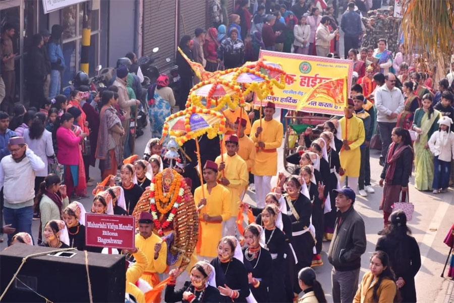 बागेश्वर। ऐतिहासिक उत्तरायणी मेले का शुभारंभ मंगलवार को पारंपरिक सांस्कृतिक झांकी के साथ उत्साहपूर्वक हुआ। झांकी को जिला पंचायत अध्यक्ष शोभा आर्या, विधायक पार्वती दास, सुरेश गढ़िया, दर्जा राज्यमंत्री शिव सिंह बिष्ट, भूपेश उपाध्याय, जिलाधिकारी आकांक्षा कोंडे, पुलिस अधीक्षक चंद्रशेखर आर. घोड़के, पालिकाध्यक्ष सुरेश खेतवाल, सहित अन्य जनप्रतिनिधियों ने हरी झंडी दिखाकर रवाना किया। झांकी में कुमाऊँनी वाद्य यंत्र ढोल-दमाऊं और छोलियारों ने जोश भर दिया, वहीं कलाकारों एवं स्कूली बच्चों ने स्थानीय लोकसंस्कृति के साथ देश के विभिन्न प्रांतों की सांस्कृतिक झलक प्रस्तुत की। झांकी तहसील परिसर से प्रारंभ होकर नुमाइशखेत मैदान में संपन्न हुई। झांकी की अगुवाई संस्कृति व विजय के प्रतीक ‘निषाण’ के साथ की गई। इसके पश्चात छोलियारों का दल, राबाइंका बागेश्वर की कलश यात्रा तथा विभिन्न विद्यालयो-न्यू सैनिक जूहा स्कूल, हिमालयन सेंट्रल स्कूल, राइंका मंडलसेरा, विवेकानंद विद्या मंदिर, महर्षि विद्या मंदिर बिलौना, आनंदी एकेडमी, सेंट जोजफ थूनाई, गायत्री विद्या मंदिर, हिमालयन चिल्ड्रन एकेडमी, कंट्रीवाइड पब्लिक स्कूल, सैनिक हाईस्कूल, सरस्वती शिशु मंदिर चौरासी, नेशनल मिशन स्कूल एवं राइंका सैलानी-के विद्यार्थियों ने विविध सांस्कृतिक प्रस्तुतियों व सामाजिक संदेशों के साथ सहभागिता की। जौहार सांस्कृतिक समिति तथा मदकोट का नगाड़ा भी आकर्षण का केंद्र रहा। इस अवसर पर अपर जिलाधिकारी एन.एस. नबियाल, मुख्य विकास अधिकारी आर.सी. तिवारी, उपजिलाधिकारी एवं मेलाधिकारी प्रियंका रानी सहित अनेक अधिकारी, जनप्रतिनिधि एवं गणमान्य नागरिक उपस्थित रहे।