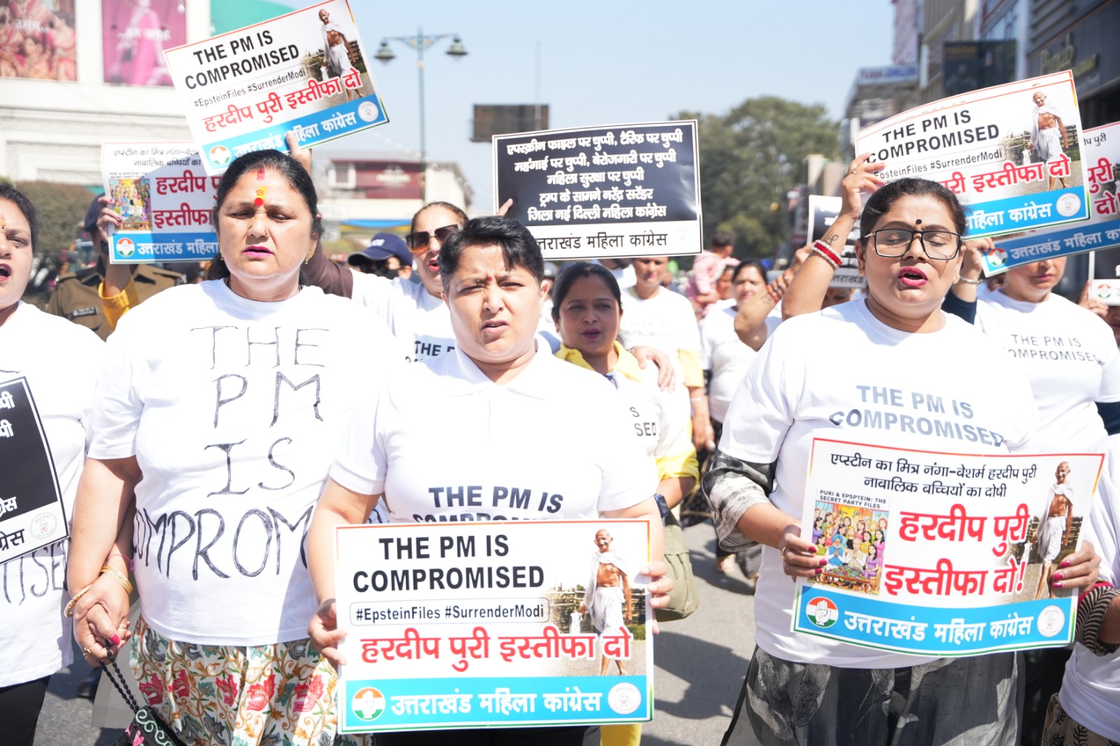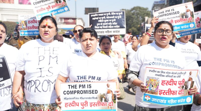 देहरादून 3 मार्च। प्रधानमंत्री नरेन्द्र मोदी एवं केन्द्रीय मंत्री हरदीप पुरी का नाम एपस्टीन फाईल में उजागर होने पर हरदीप पुरी के इस्तीफे की मांग को लेकर आज प्रदेश महिला कांग्रेस अध्यक्ष श्रीमती ज्योत रौतेला के नेतृत्व में महिला कांग्रेस कार्यकर्ताओं ने प्रदेश कांग्रेस कार्यालय राजीव भवन से गांधी पार्क- घंटाघर- पल्टन बाजार होते हुए तहसील चौक एवं वापस प्रदेश कांग्रेस कार्यालय तक THE PM IS Compromised लिखी विषेश पोषाक पहनकर विरोध-प्रदर्शन के साथ मार्च निकाला तथा केन्द्रीय मंत्री हरदीप पुरी के इस्तीफे की मांग की। पूर्व निर्धारित कार्यक्रम के तहत महिला कांग्रेस कार्यकर्ता बडी संख्या में प्रदेश कांग्रेस कार्यालय राजीव भवन में एकत्र हुए जहां से उन्होंने प्रदेश महिला अध्यक्ष ज्योति रौतेला के नेतृत्व में नारेबाजी करते हुए पल्टन बाजार की ओर कूच किया।